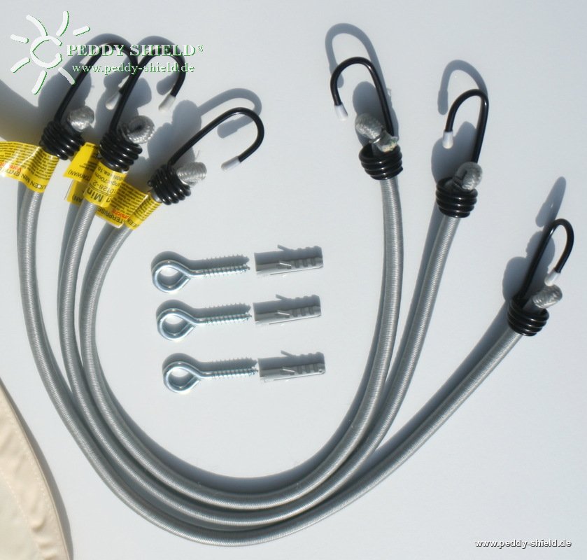 Alle konkaven Dreiecksegel von Peddy Shield immer zusammen mit 3x dauerelastischen Spanngurten, Dübeln und Ringösenschrauben für eine schnelle Sonnensegelmontage.