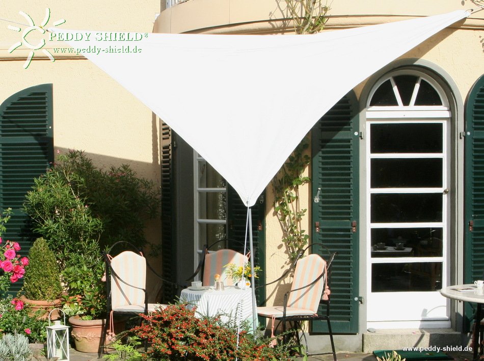 Bei einem Dreiecksonnensegel aus Polyesterstoff dürfen in der Mitte weder eine Beulen, noch Falten sein, weil sonst bei Regen die Gefahr der Bildung von Wassersäcken besteht.