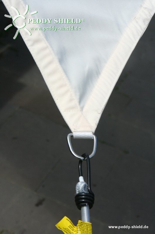 Der so eingebaute Windschutz durch die elastischen Federelemente schützt das Dreiecksonnensegel vor harten Windböen. Auch die Befestigungspunkte werden vor einer extremen Zugbelastung geschützt.