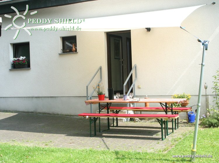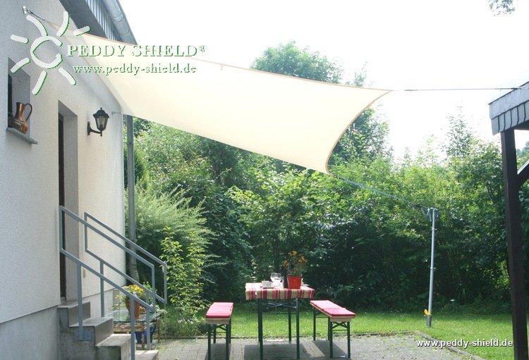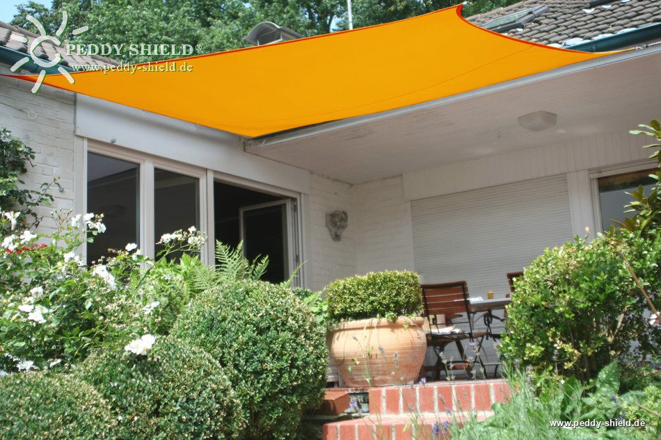 Ein wunderschön textiles und pflegleichtes Sonnenschutzsegel, das auch als Regenschutz dient.